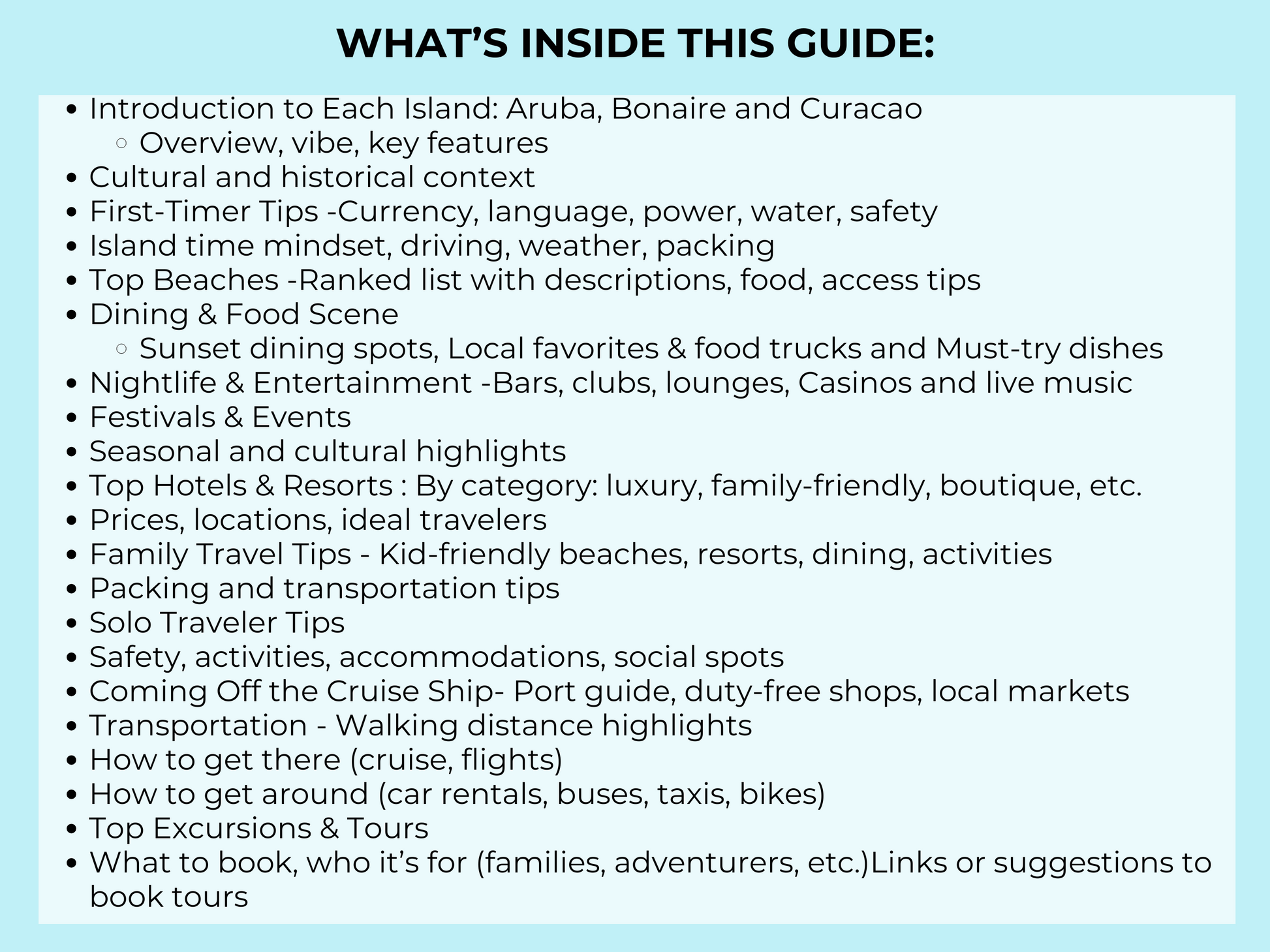 Whether you're flying in for a tropical escape or docking for a day on a cruise, this interactive, clickable travel guide is your all-in-one digital planner for the breathtaking islands of Aruba, Curaçao, and Bonaire.